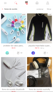 Fui navegar pelo app da Enjoei e iniciei minhas buscas por um produto específico: fones de ouvido. Quando a tela de resultados abriu, haviam diversas opções desse mesmo produto.
