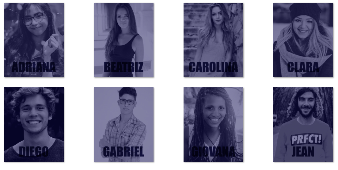 "Todos as fotos dos alunos deverão ter um filtro azul, juntamente com seu nome. São um total de 100 alunos."
