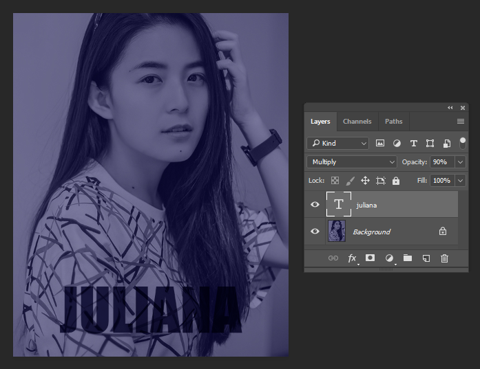 Depois, diminuímos a opacidade em 50% para criar um efeito de filtro azul e, por último, retiramos toda a saturação da foto (deixar em tons de cinza), indo em Image > Adjustments > Desaturate. Chegamos a este resultado: