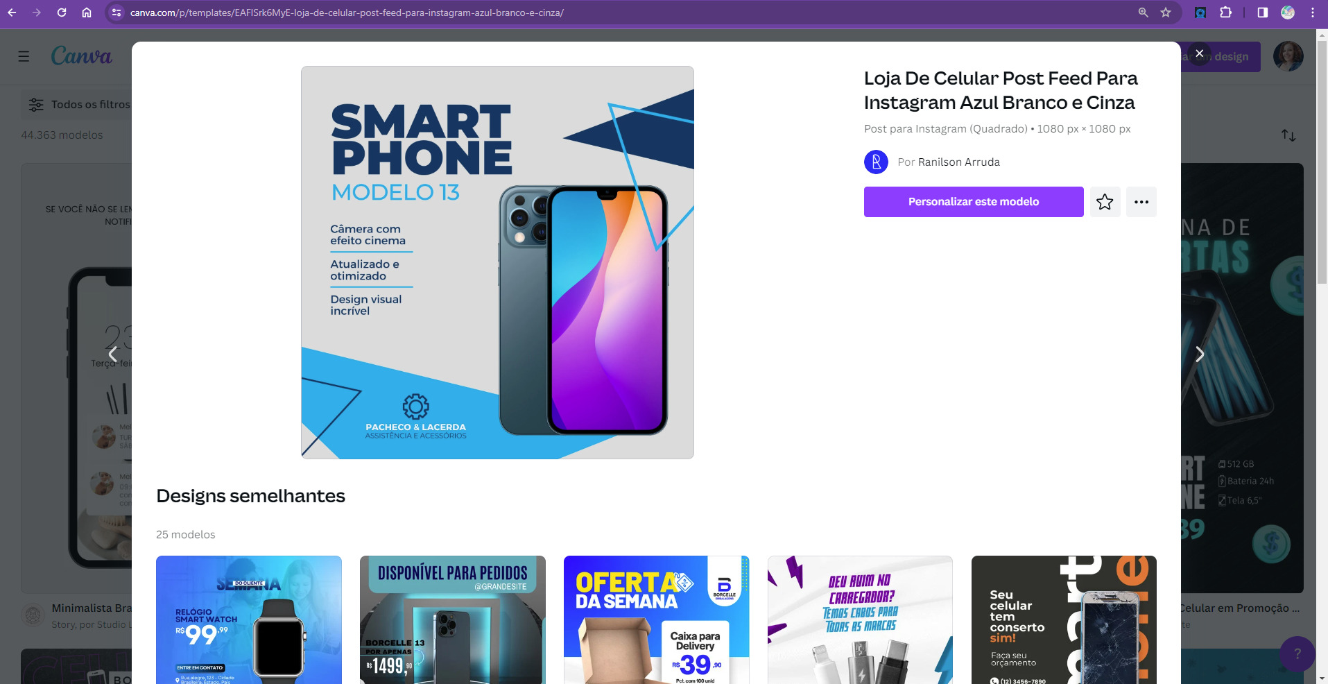 Com o texto pronto, você entra no Canva e seleciona um template para posts do Instagram. Procurando um que tenha espaço para uma imagem impactante do smartphone, texto e detalhes do evento de lançamento.