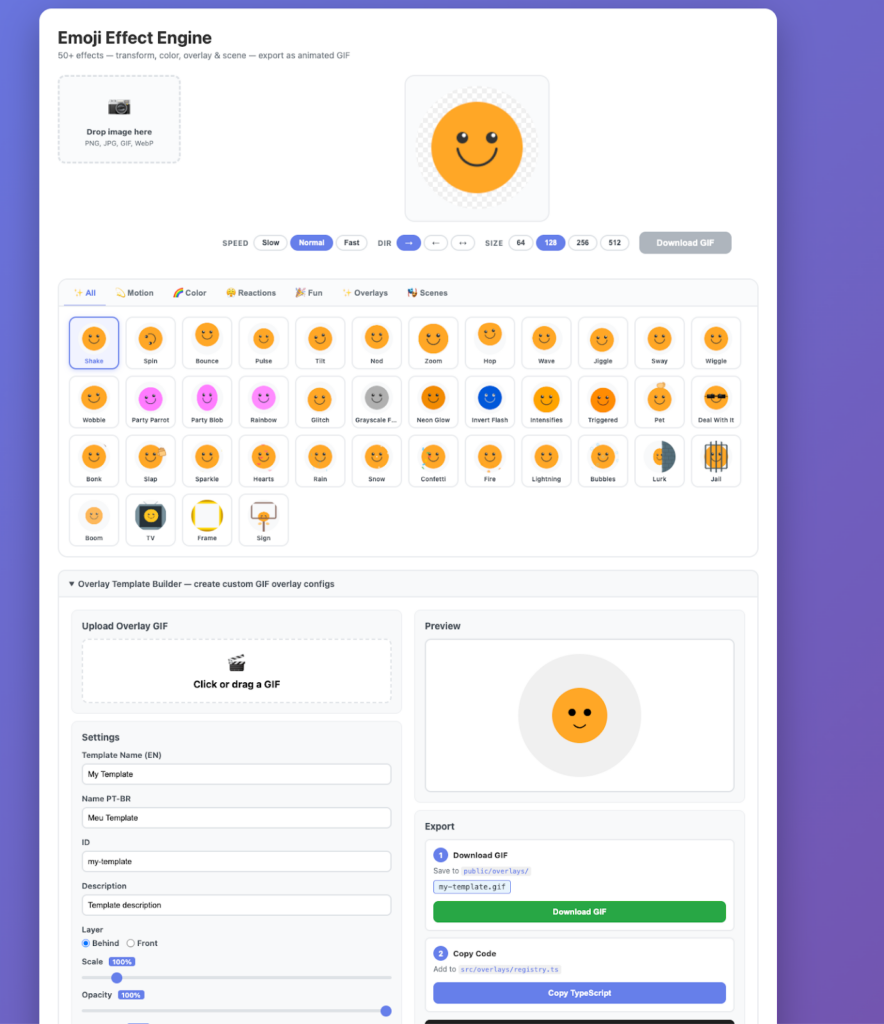 Então construí o Builder Engine, um sistema interno que faz renderização via canvas com overlays procedurais, controles de velocidade (slow, normal, fast), direção (forward, reverse, boomerang) e export de GIF. Dessa maneira eu consegui customizar overlays para colocar no gerador de emoji de maneira mais prática
