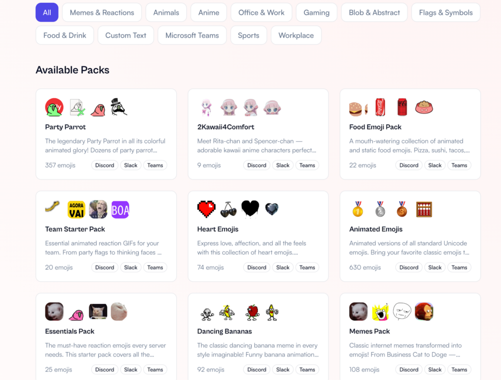 Com isso, construí um scraper que varreu várias bases de dados públicas de emojis, pedi pro Claude Cowork categorizar tudo em pastas contextualizadas, e as páginas de cada pack foram geradas automaticamente. Hoje o site tem mais de 13 mil emojis.