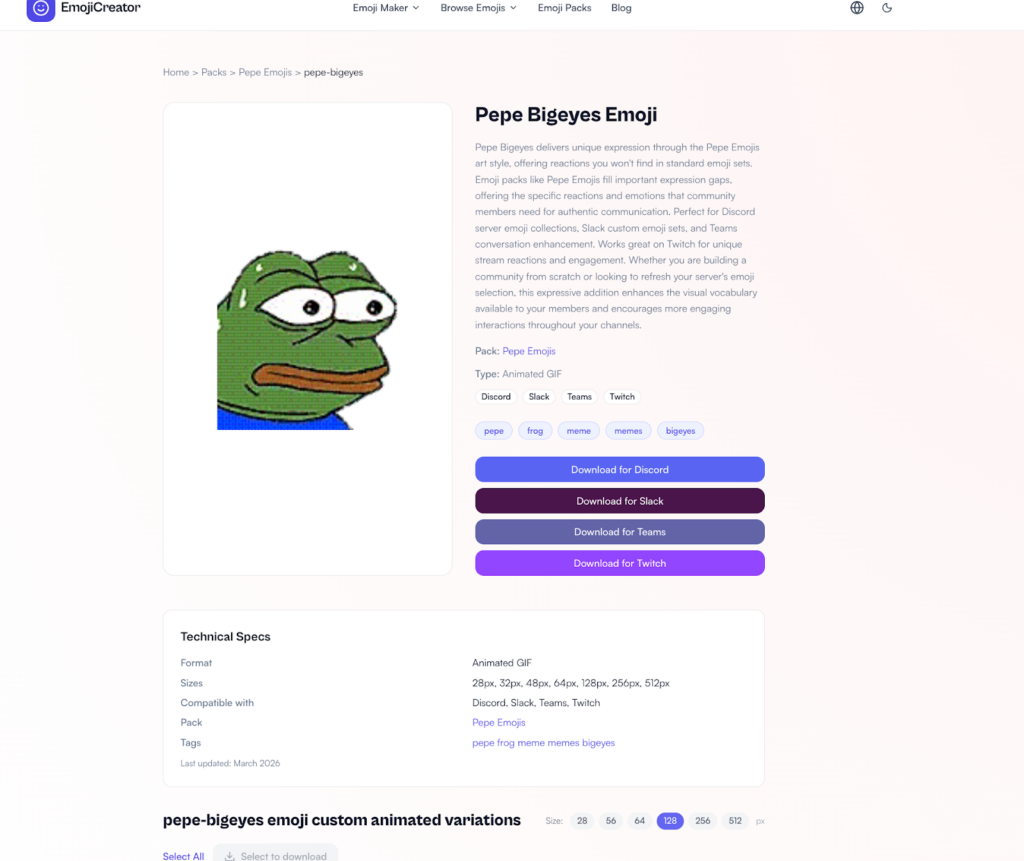 Criei páginas específicas de criação de emoji pro Discord, Slack, Twitch e Teams. Mesmo site, texto e imagens diferentes, estrutura igual. Simples de manter, mais superfície para ranquear.