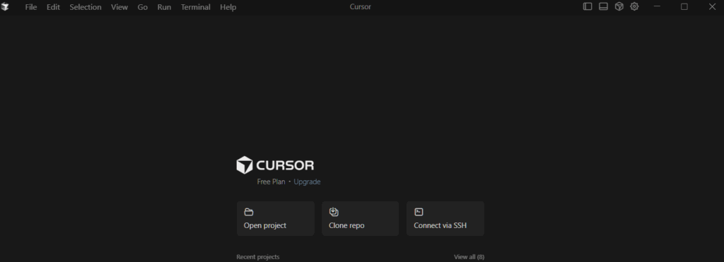 - Configuração Inicial: Ao abrir pela primeira vez, o Cursor perguntará se você deseja importar suas extensões do VS Code. Recomenda-se dizer sim para manter seu fluxo de trabalho.