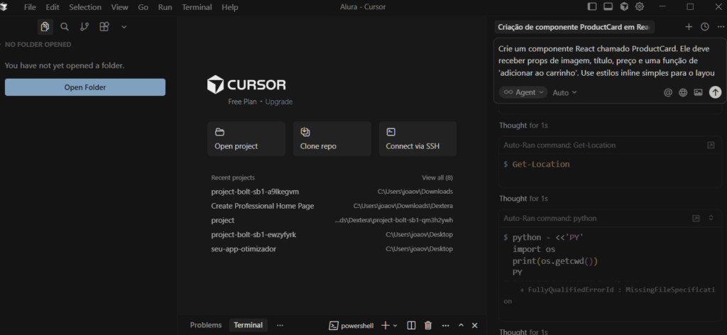 Vamos ver como o Cursor funciona na vida real. Imagine que queremos criar um componente de "Card de Produto" para um e-commerce usando React.