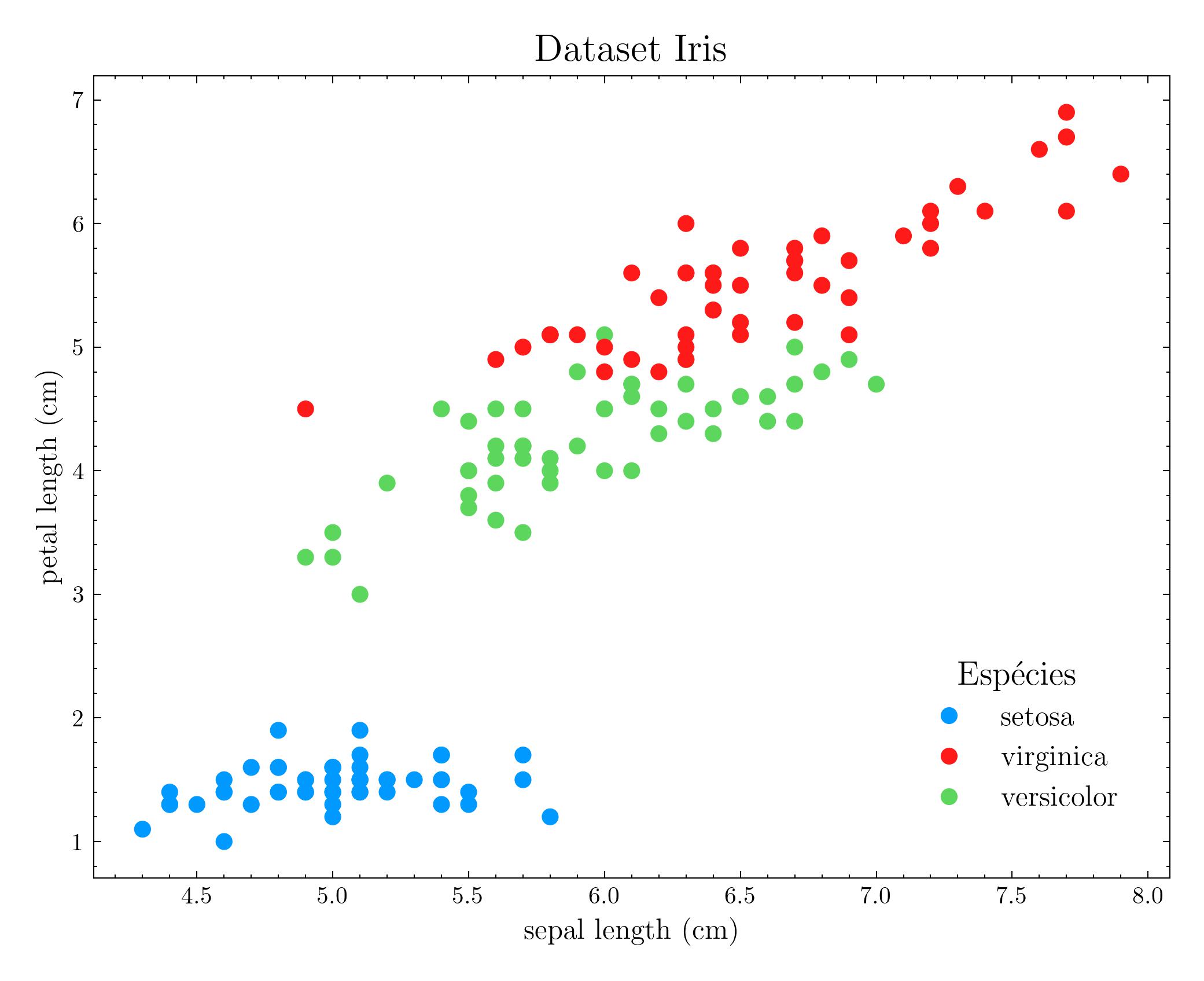 Por exemplo, utilizando um conjunto de dados (dataset) como o Iris, que possui 150 registros com o comprimento (length) de sépalas e pétalas de algumas espécies de flores Iris (a saber, virginica, versicolor e setosa), nós podemos apresentar as informações contidas nesse conjunto de algumas maneiras. Neste caso, podemos expor a tabela de dados diretamente: