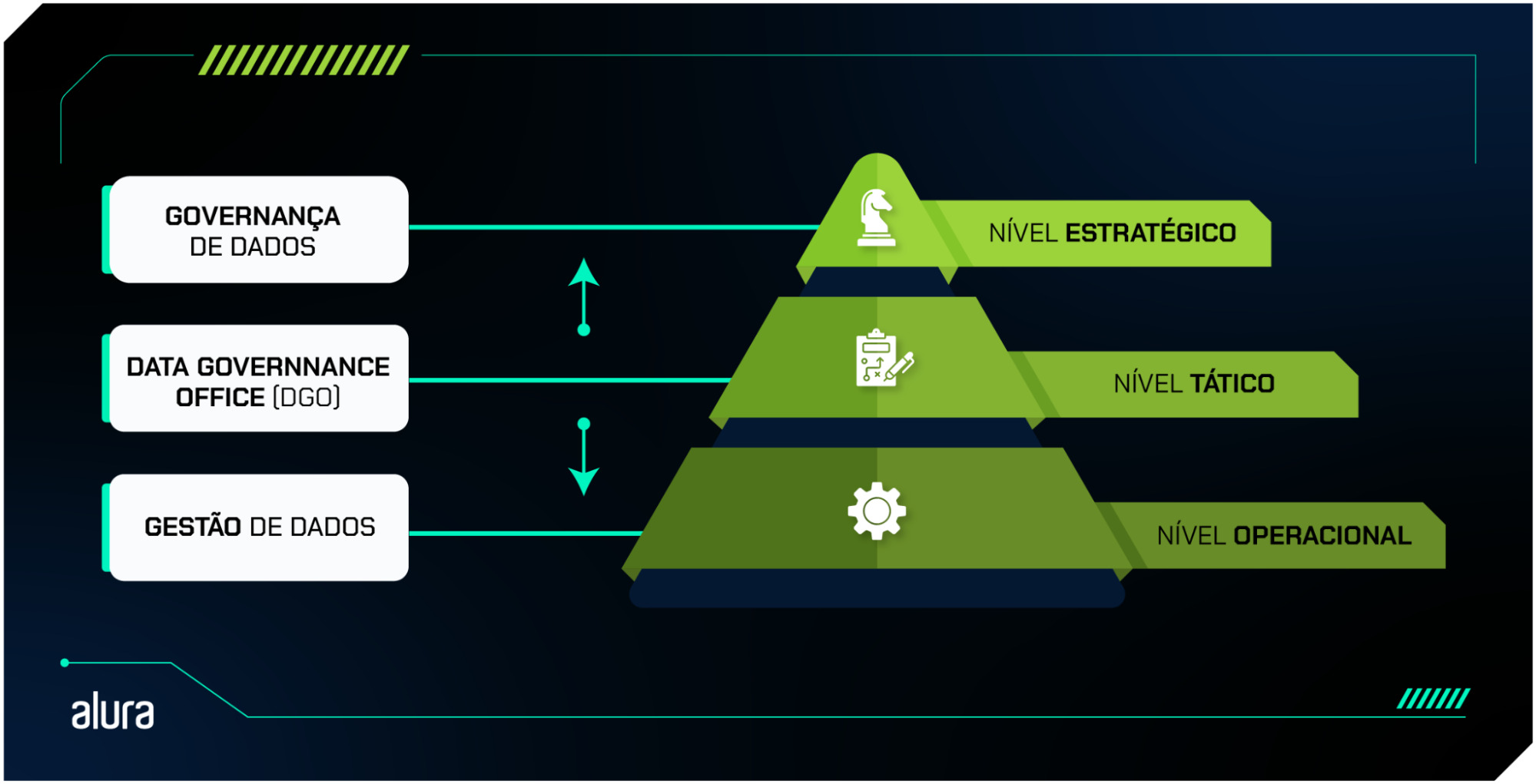Dessa forma, decisões mais ligadas ao nível estratégico fazem parte da governança de dados, enquanto decisões mais próximas ao nível operacional são denominadas de gestão de dados.